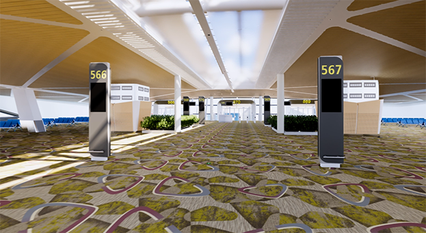 衛(wèi)星廳雖然是T3航站樓國內(nèi)候機指廊的延伸,但也需要體現(xiàn)其內(nèi)在價值和特色。與T3航站樓相比,衛(wèi)星廳建筑規(guī)模和體量都小。衛(wèi)星廳以實用性和旅客體驗為特點,因此更適合采用木色等天然材質(zhì)的作為空間主要色調(diào),積極打造深圳機場衛(wèi)星廳為一個明亮、溫馨、具有自然質(zhì)感、親切的航站樓。鋪地主要采用整體無縫磨石地坪、高端無機人造石、地毯打造,鋪地根據(jù)建筑功能,整體無縫磨石地坪主要分布三層及二層中央出港區(qū)域,地毯主要分布在三層各個指廊候機區(qū)域。其余區(qū)域鋪地為高端無機人造石。